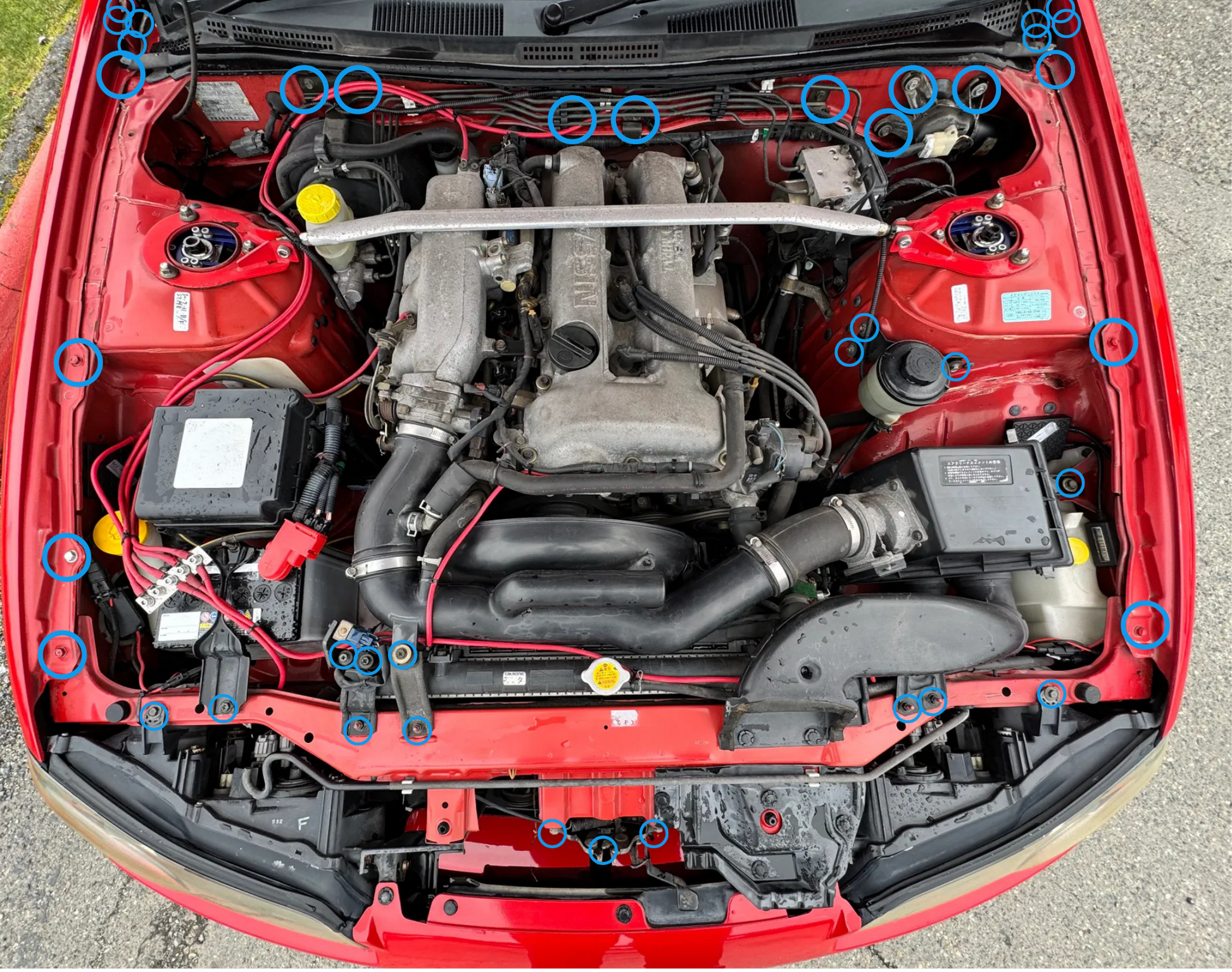 Upgrade the front end of your Nissan S15 Silvia (200sx) with this engine bay dress kit, suitable for all models in the S15 platform. Precision-engineered for a universal fit, this kit provides the necessary hardware to secure your vehicle's parts with ease and precision.
